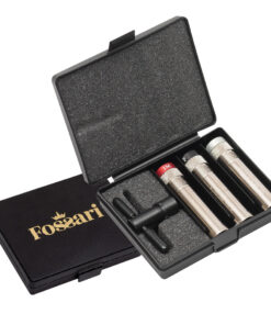Custodia nera con logo Fossari® color oro che può contenere fino a tre strozzatori TECHNICHOKE® HPS ed una chiave ad essi dedicata.